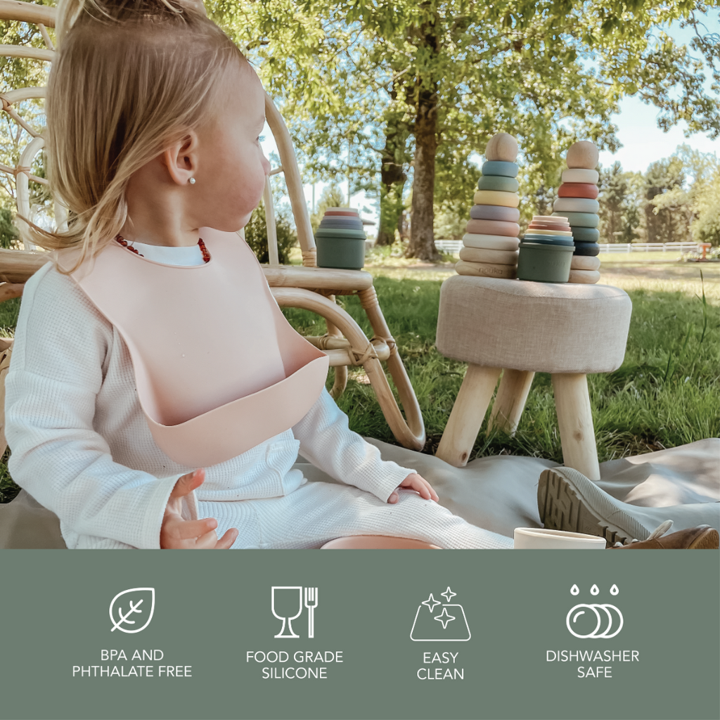 Protect from spills and messes with noüka’s Silicone Bib. These silicone baby bibs are waterproof to prevent leaks and keep your little one dry and comfortable throughout mealtime. A deep pocket catches crumbs, drips, and drools for less mess. Simply wipe clean after meals or wash in the dishwasher to always have a clean bib on hand. Made from durable, long-lasting food grade silicone, the Silicone Bib is available in an array of calming, modern colors and prints for your little one.